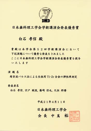 平成21年4月11日、マテリアル工学科の篠崎准教授が他大学の3名の教員とともに「学術講演会発表優秀賞」を受賞しました。同賞は、平成20年9月に大阪府豊中市で開催された日本歯科理工学会第52回学術講演会において発表された演題の中から優秀と認められた研究発表に対して授与されたものです。なお、学会で発表を行った白石孝信氏(長崎大学)は、マテリアル工学科の前身である九州工業大学金属工学科の出身です。