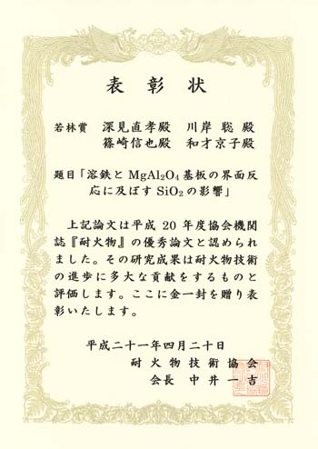 平成21年4月20日、マテリアル工学科の院生と教員の4名が耐火物技術協会より若林賞を受賞しました。同賞は、平成20年度に学術論文誌「耐火物」に掲載された論文の中から優秀と認められた4つの論文に対して授与されたものです。なお、第一著者の深見直孝氏は椛蛹炉材に所属する社会人であり、現在工学博士の学位を取得するために母校である九州工業大学の大学院生としても研究活動を行っています。